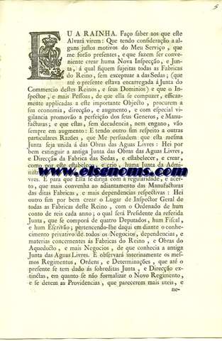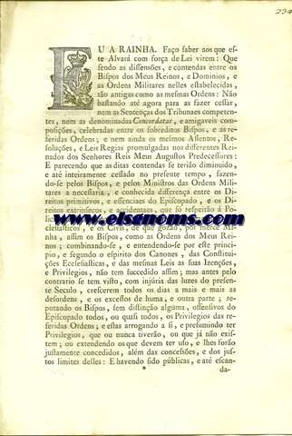 Eu El Rey Faço saber aos que este Alvará de Ley virem, que por me representarem o Director, e Censores da Academia Real da Historia Portugueza, Ecclesiastica, e Secular, que procurando examinar por fi, e pelos Academicos os Monumentos antigos, que havia, e se podiaõ descobrir no Reyno, dos tempos, en que nelle dominaraõ os Phenîces, Gregos, Persos, Romanos, Godos, e Arabios, se achava que muitos, que pudéraõ existir nos edificios, estatuas, marmores, cippos, laminas, chapas, medalhas, moédas, e outros artefactos, por incuria, e ignorancia do vulgo se tinhaõ consumido, perdendo-se por este modo hum meyo muy proprio, e adequado, para verificar muitas noticias da veneravel antigidade, assi Sagrada, como Politica; e que serîa muy conveniente á luz da verdade, e conhecimento dos Seculos passados, que, no que restava de simelhantes memorias, e nas que o tempo descobrisse, se evitasse este damno, em que póde ser muito interessada a gloria da Naçaõ Portugueza.