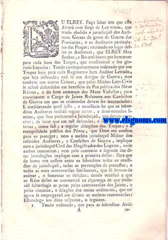 Eu El Rey. Faço saber aos que este Alvará de Declaraçaõe Ampliaçaõ virem: Alvará com força de Ley, porque V. Magestade ha por bem declarar, e ampliar o Regimento, porque novissimamente soy servido regular os emolumentos dos Ministros, e Officiaes de Justiça do Estado do Brasil, quanto a formar cada hum dos Ouvidores das respectivas Comarcas hum arbitramento para o sustento dos Escravos prezos, conforme os preços dos generos, que servem de alimento nas terras; determinando as porçoens, que os Carcereiros deveráõ dar a cada hum dos sobreditos prezos, em quantidades e qualidades certas, debaixo das penas, e declaraçoens assima mencionadas.
