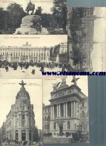 150 x 100 mm. 8 postales en blanco y negro. Madrid, Paris, José Amenábar, V. Poblador, E.J.G., (Ap.1903-1910). Raro conjunto de postales, de las cuales 3 no tienen partido verticalmente el reverso. |