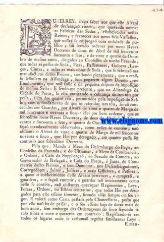 Eu El Rey. Faço saber aos que este Alvará com força de Ley virem: Alvará de Ley, porque V. Magestade ha por bem cassar, e revogar o Alvará de vinte de Fevereiro de mil setecentos quarenta e oito, permittindo sómente que os Moradores das Ilhas em lugar de cada hum dos Navios de quinientas caixas, que deviaõ navegar para os pórtos do Brasil, possaõ expedir tres, ou quatro de menos pórte, com tanto que vaõ das sobreditas Ilhas em direita viagem carregados de géneros, que elles produzem, e nellas se fabricaõ : Tudo na fórma que acima se declara.